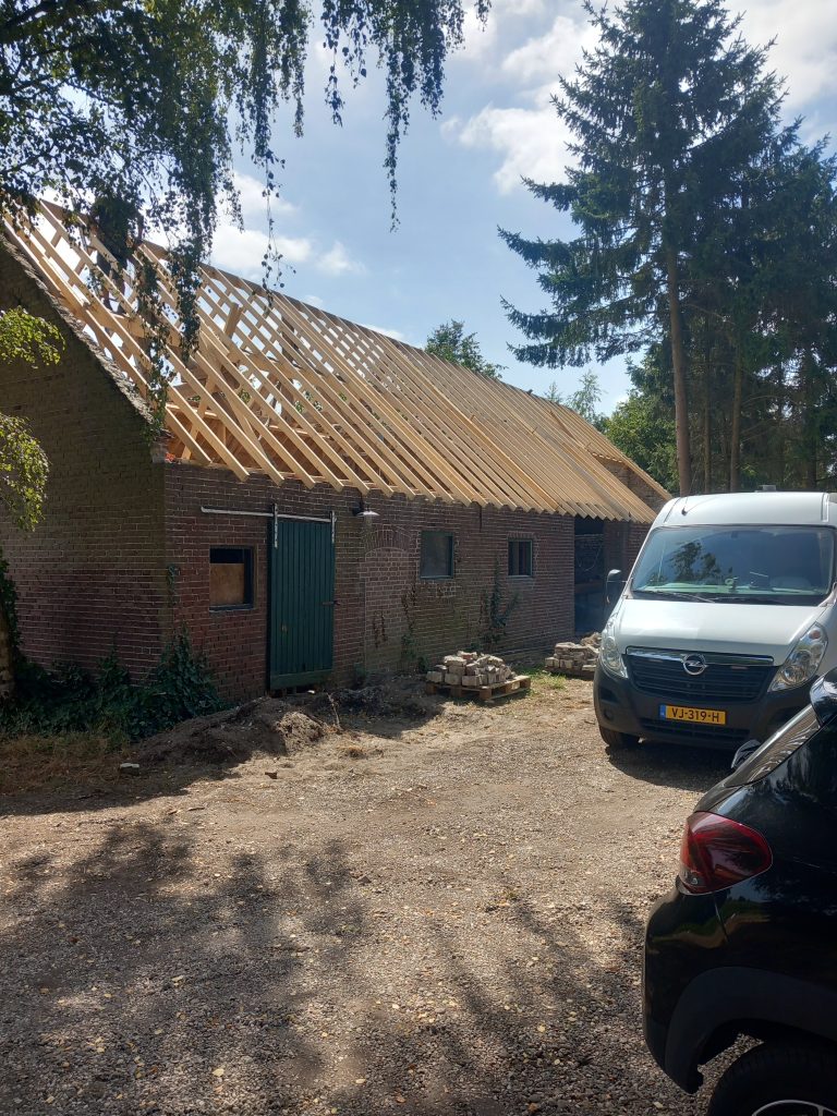 Oude dak gesloopt, oude spanten behouden en compleet nieuw dak gemaakt op schuur.